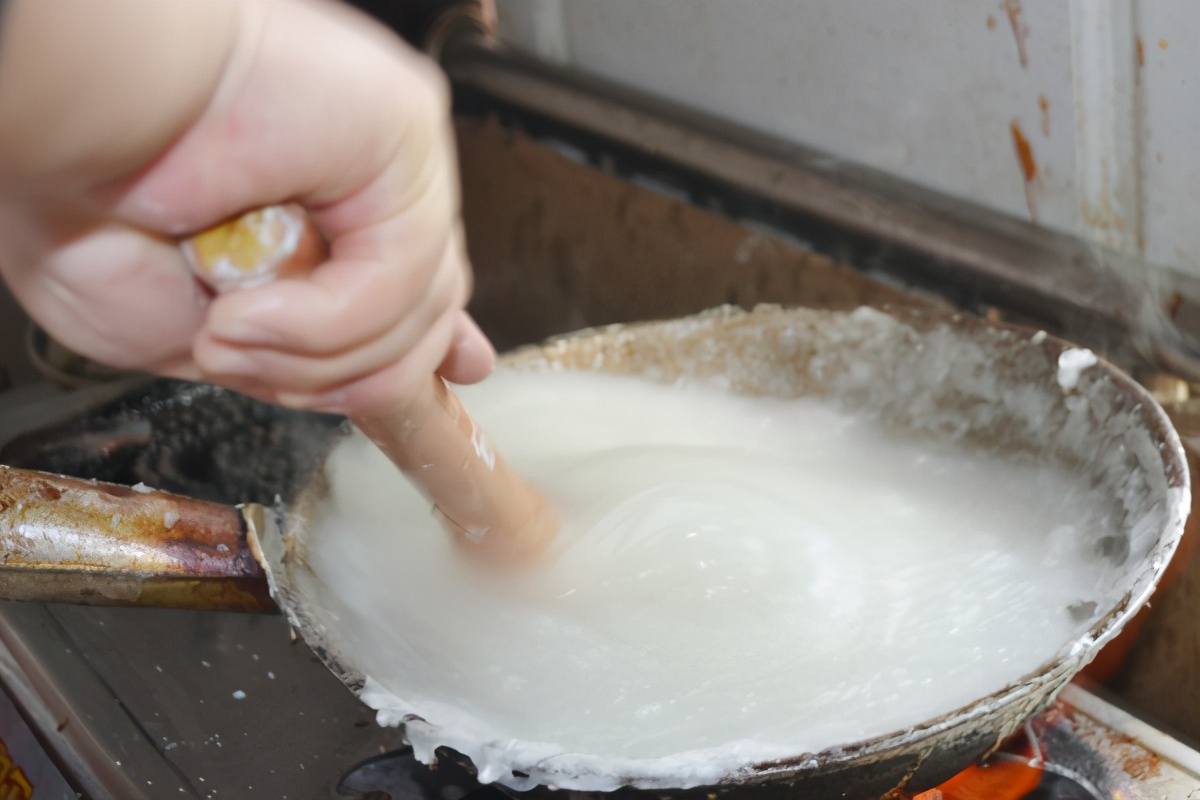 卤汁凉粉是分为几种配料,融合在一起的, 最关键的当然就是凉粉了。这里面的凉粉是豌豆粉加水搅成糊,豌豆粉和水的比例是1:7,学卤汁凉粉到西安大品小吃培训来。但是制作的时候豌豆粉先用一点水稀释一下,然后锅内烧开水,然后把稀释后的豌豆粉慢慢的搅拌均匀倒进去,等到豌豆面糊煮到变稠有点透明了,然后倒进大的容器里晾凉。凉透后的豌豆粉就可以切条了。