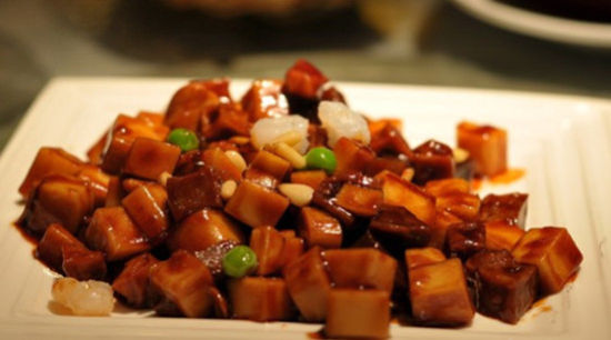 “八宝肉辣子”是陕西渭北民间筵席中必不可少的下饭菜,因其配料、调料众多,故名“八宝”。此菜以猪肉、杏仁、潼关酱笋、青豆、辣椒面等烹制而成,油汁鲜红,香辣味浓,关中人喜欢把它夹在热馒头中食用,是物美价廉的大众化家常名菜。