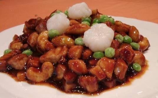 2.炒锅加菜籽油100克,旺火烧六成热,投入葱段偏出香味,随即下肉丁煸炒,下青豆、玉兰片、酱笋、杏仁、海米、加酱油,炒至熟透,再加精盐、面酱炒匀,拨在锅边。再加菜籽油50克烧六成热,将辣椒面倒人油内炸出红油,与肉搅匀,出锅装盘即成。