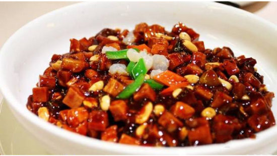 八宝肉辣子也叫酱辣子、八宝辣子是陕西渭北民间筵席中必不可少的下饭菜,因其配料、调料众多,故名“八宝”。此菜以猪肉、杏仁、潼关酱笋、青豆、辣椒面等烹制而成,油汁鲜红,香辣味浓,关中人喜欢把它夹在热馒头中食用,是物美价廉的传统名菜。