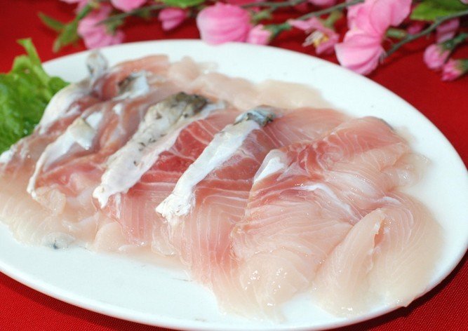 3.在 虾的同时,将另一锅坐火上烧热,加入猪油,烧至五成热时,将鱼片肉朝下逐片放入油锅内过油。约 1 分钟后,滗油,加入清汤 150 克和长葱、香糟酒、白糖、味精、食盐,晃动炒锅,煨约 1 分钟,然后用