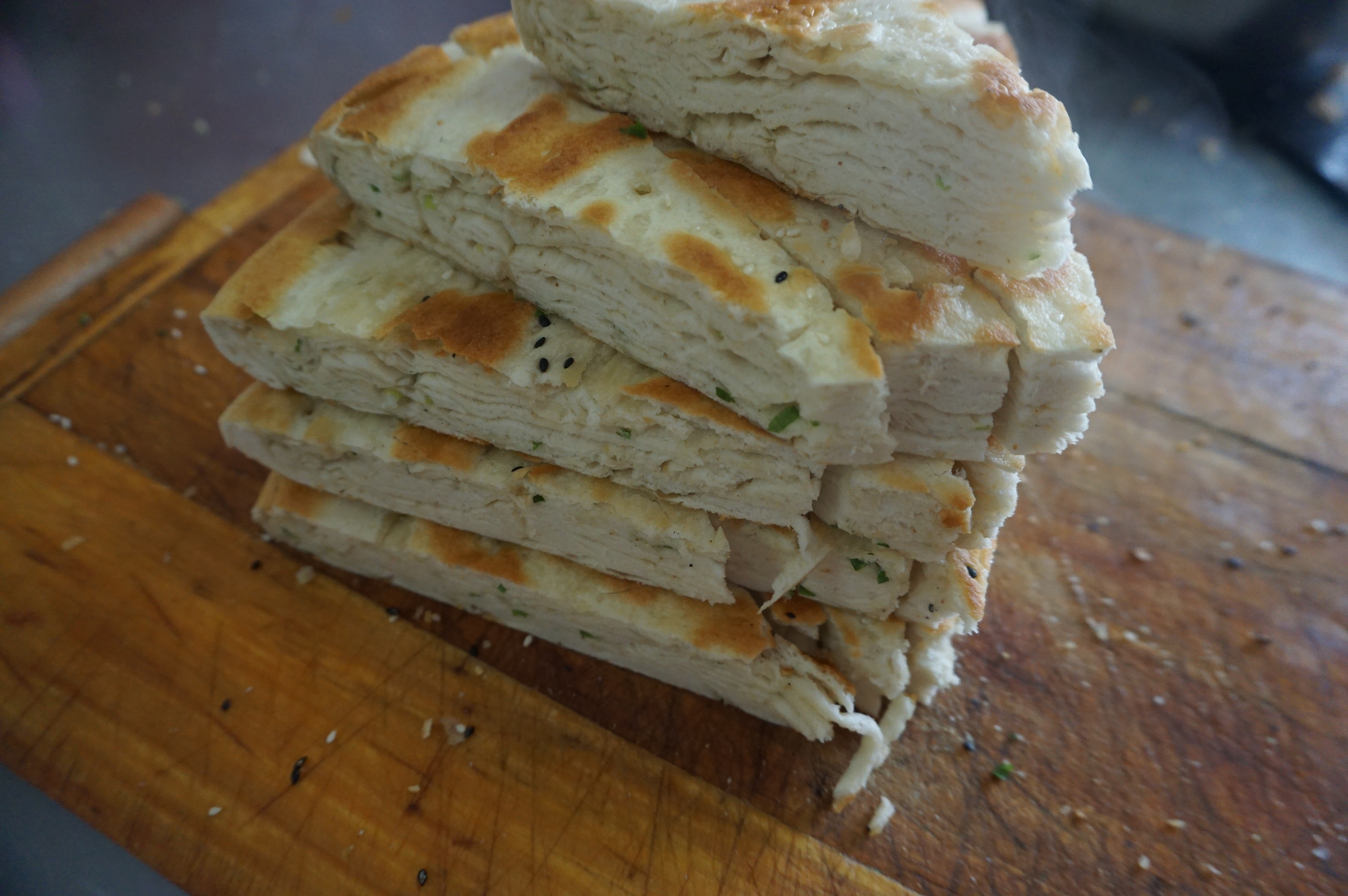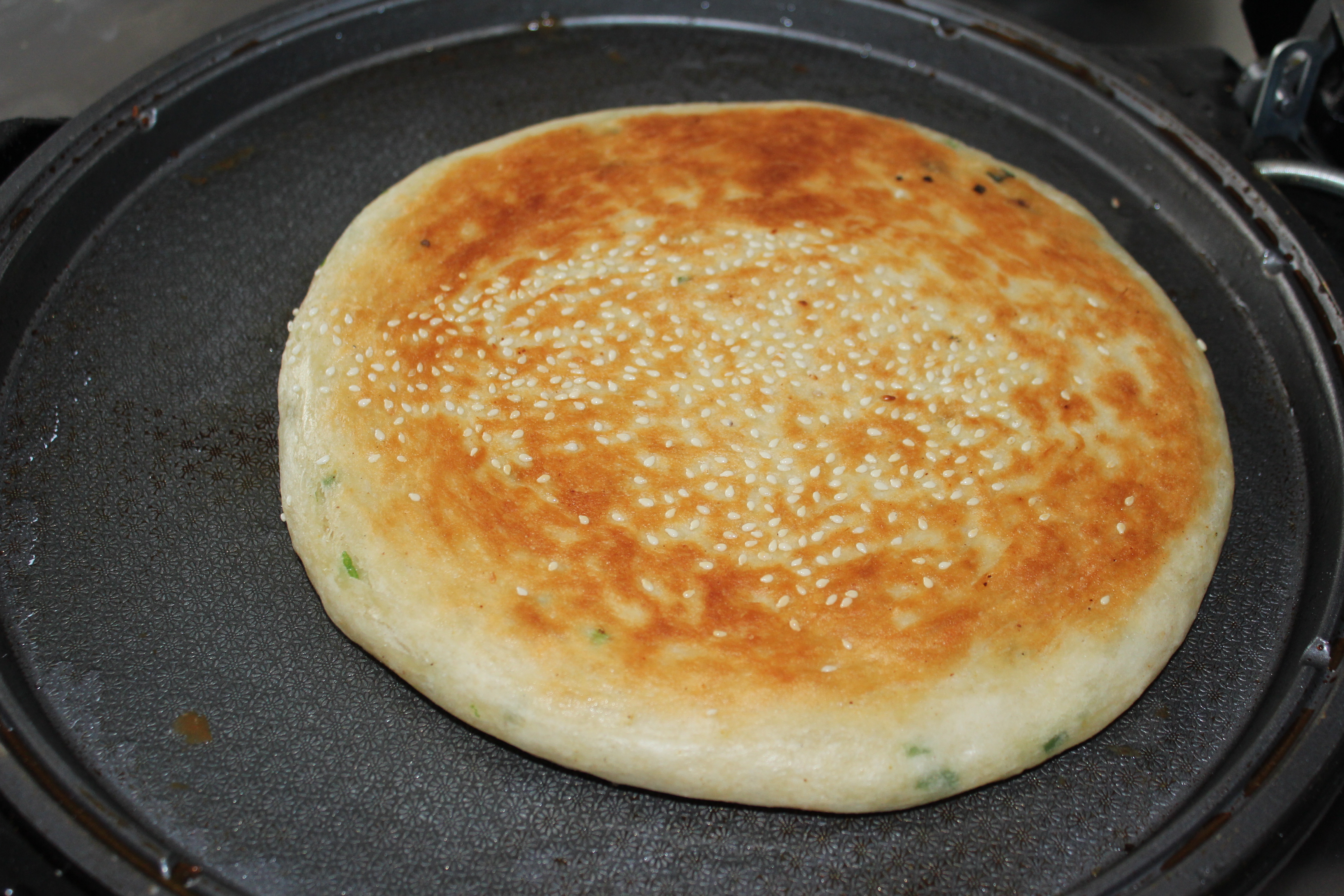 2、葱花洗净切碎备用 3、取一块醒好的面块,揉成长条,擀成长片,依次刷油·撒盐·十三香·鸡精·最后撒一层葱花·可根据自己口 味加适量, 4、将面条一层一层叠起来,上下捏住口,反过来,擀成皮,撒上白芝麻。 5、电饼铛内刷油,把面块下到锅内,盖锅。