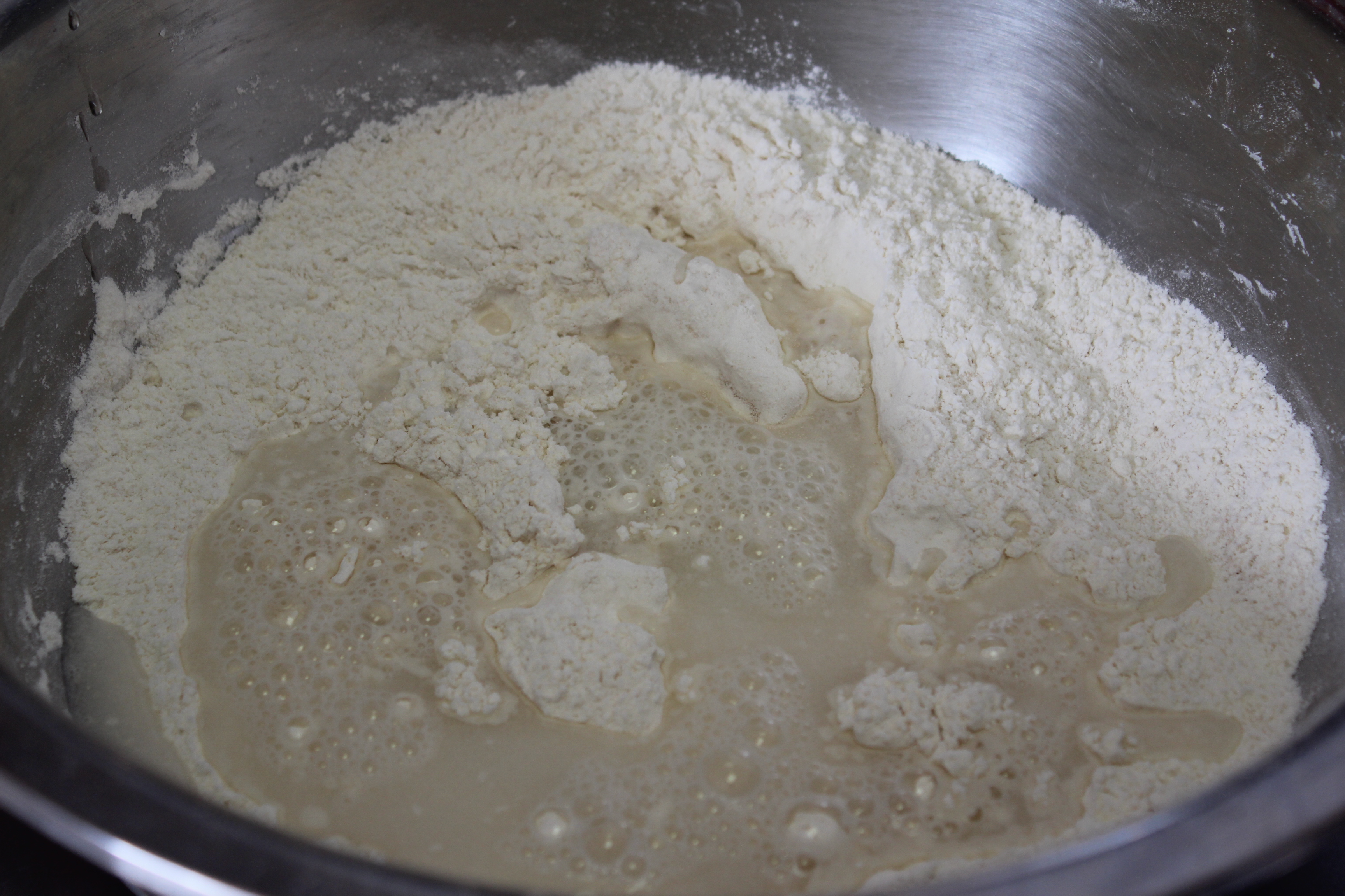 步骤:1、盆里加面·酵母·温水活成面块,不要太硬,醒上20分钟。
