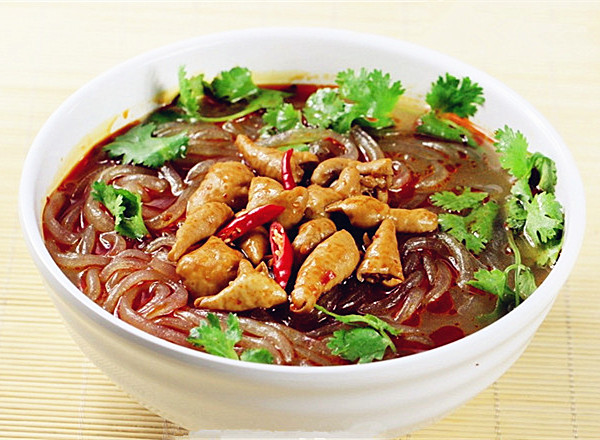 注意:先将泡好的红薯粉放进沸腾的肥肠汤锅里来回荡几下,捞起来后倒入已放好肥肠和调料的大口碗里,最后从汤锅里舀一大勺沸汤沿粉浇淋下去,再往碗里放几粒花生和几抹葱花即可。具体里面的配菜,搭配可以按当地个人喜好随意更换。