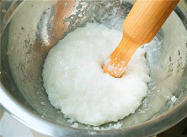 2、糯米饭趁热加糖,用擀面棍捣蓉捣烂,或带上一次性手套抹点油抓捏,还可以握住拳头捣蓉,让糯米饭有较强的黏性。
