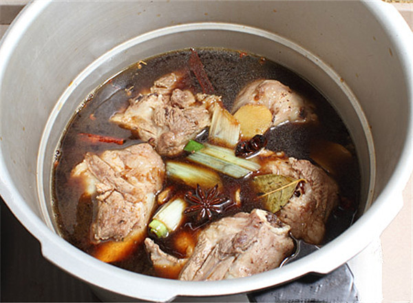 第一锅汤,即炖煮鸡、排骨或猪肉的汤汁。除主料外,还应加花椒、大料、胡椒、肉桂、丁香、陈皮、草果、小茴香、山柰、桂皮、鲜姜、食盐、白糖等调料。上述调料的品种并非缺一不可,调料的数量依主料的多少而定,不易拣出的调料要用纱布包好。