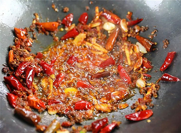 2.油锅烧热,下白糖炒化,下姜、蒜、葱爆香,下入除辣椒、香叶外的所有香料。