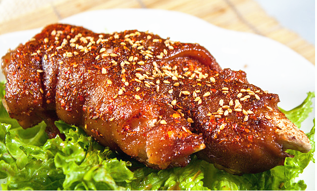 猪蹄又叫猪脚、猪手,前蹄为猪手,后台为猪脚。猪蹄含有丰富的胶原蛋白,能增强皮肤弹性和韧性。先把猪蹄在锅中卤出香味,在进行烘烤,烤好的猪蹄皮酥里嫩,香而不腻。