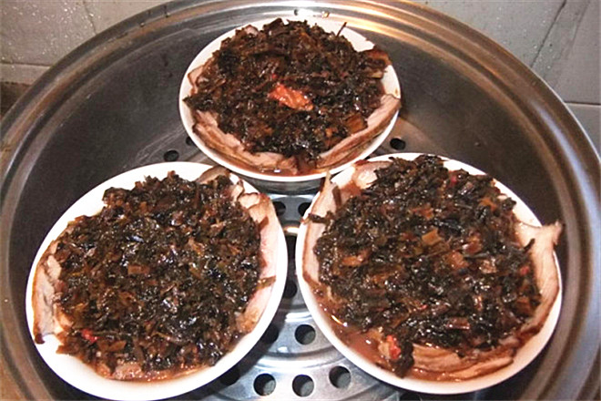 最后把切片的肉摆入大碗里,把炒好的梅菜均匀铺在肉上面,剩余汤汁一并浇上。蒸1小时取出滗出汤汁。把大碗扣在更大一点的盘里,滗出的汤汁加入少许淀粉入锅加热至粘稠,浇在大盘的扣肉上。