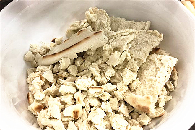 6.烙好的饼掰碎成约小指尖大小的小粒,放在碗里。鸡蛋打到碗里搅散。