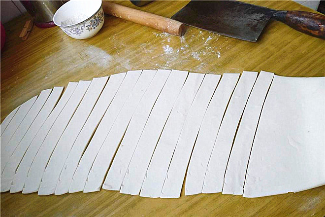 2.根据案板大小,将揉好的面分成小面团。案板上撒上干面粉,防止面团粘到案板上,把醒好的面团放在案板上揉匀、揉光滑。用擀面杖将面团擀成圆形状,薄厚约2-3mm左右。将擀好的面切成长宽条状。