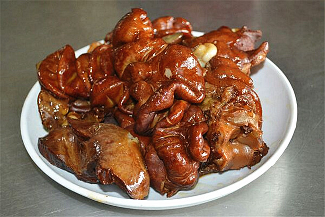 1.猪肚、猪心、猪肝、猪肺、猪肠,洗干净尤其是猪肠,翻过来,把肠壁的浮油摘尽煮开,撇去血污,加盐,香料:八角、花椒、桂皮、丁香、孜然、良姜、草果之类卤制,大约八成熟,捞出,沥干。