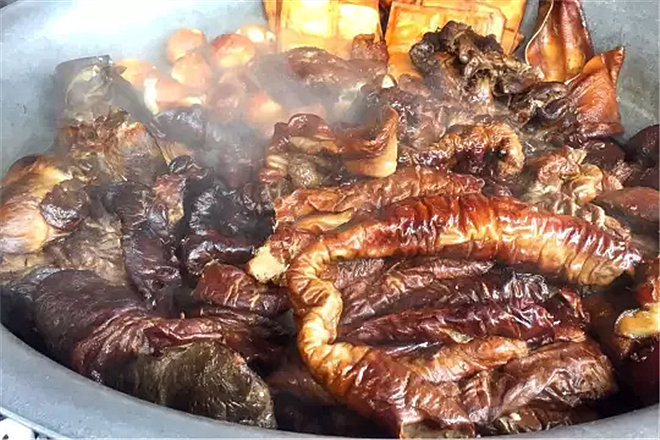 3.约摸十分钟,开盖,端下铁箅子,擦去肉上浮灰,可见肉已熏出的漂亮红褐色,深了浅了视火候,下次调节熏制时间长短,把所有的下水翻个儿,加锯末,上锅另盖,再熏同样时间,这便是一锅上下色泽一致的梆梆肉。