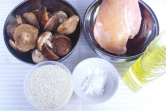 大米100g、鸡胸肉50g、干香菇5朵、杂菜50克、姜片适量、盐1/4小勺