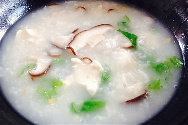 3.大火烧开转小火煮至米粒开花。倒入鸡肉丁、香菇丁、姜丝,迅速搅散煮3分钟。将杂菜倒入锅内。