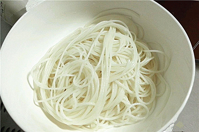 1.米线温水中浸泡1小时,然后热水煮2分钟。煮软的米线用冷水冲一下,沥干水分备用。
