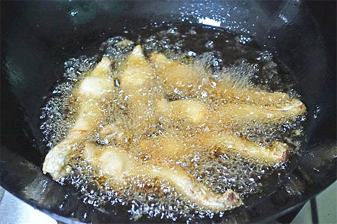 4.油锅烧热,倒入适量玉米油,油烧热。鱼块分次入油锅内,炸至金黄。