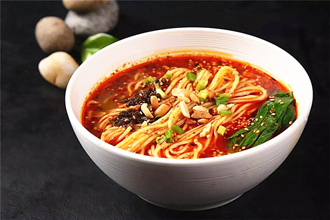 担担面是一道由面粉、红辣椒油、芝麻酱、葱花等材料制作而成的川菜。是著名的成都小吃。担担面面条细薄,卤汁酥香,咸鲜微辣,香气扑鼻,十分入味。此菜在四川广为流传,常作为筵席点心。
