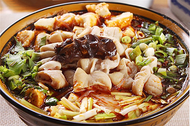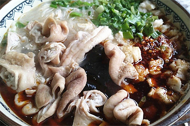 面粉适量、猪大骨一根、鸡腿三根、肥肠适量、猪肚适量、草果适量、八角适量、桂皮适量、花椒适量、韭黄适量、香菜适量、粉丝适量、味精适量、盐适量、油泼辣子适量