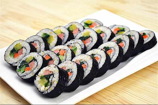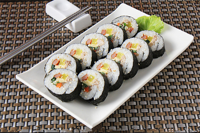 有人管它叫寿司,其实也没错,紫菜包饭是寿司的一种,之所以在韩餐中常见,是因为朝鲜半岛饮食受日本饮食习惯影响的缘故。与花样繁多、用料讲究、做法细致的日本花样寿司相比,紫菜包饭不仅好学易做,而且不必追求高档的食材,搭配随意,无论是做还是吃,都显得很家常、很平民化,而且很容易让人接受。金枪鱼紫菜包饭原料有米饭,黄瓜(洗净切成细条),油浸金枪鱼罐头,腌萝卜),海苔,香油,盐,味素,芝麻,竹帘等。