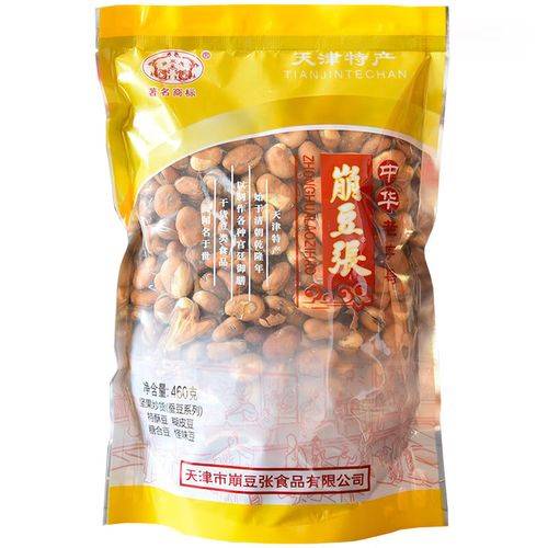 崩豆张是拥有二百四十多年历史的中华老字号,源于嘉庆年间的宫廷御膳房,1990 年还成为北京亚运会指定产品。选用蚕豆为原料,加入桂皮、甘草、当归等内外五料炒制,成品黑黄油亮如虎皮,膨鼓有裂纹,不牙碜、脆而不硬。